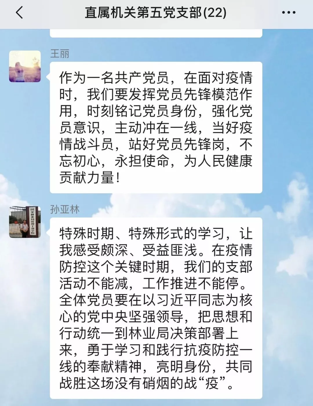 在线的18名党员中,还有林业局的三位领导以普通党员身份参加学习。党员们除了学习领会党中央关于疫情防控的决策部署和林业局的具体要求外,还学习掌握了疫情防控小常识,在群中纷纷晒心得、谈体会。